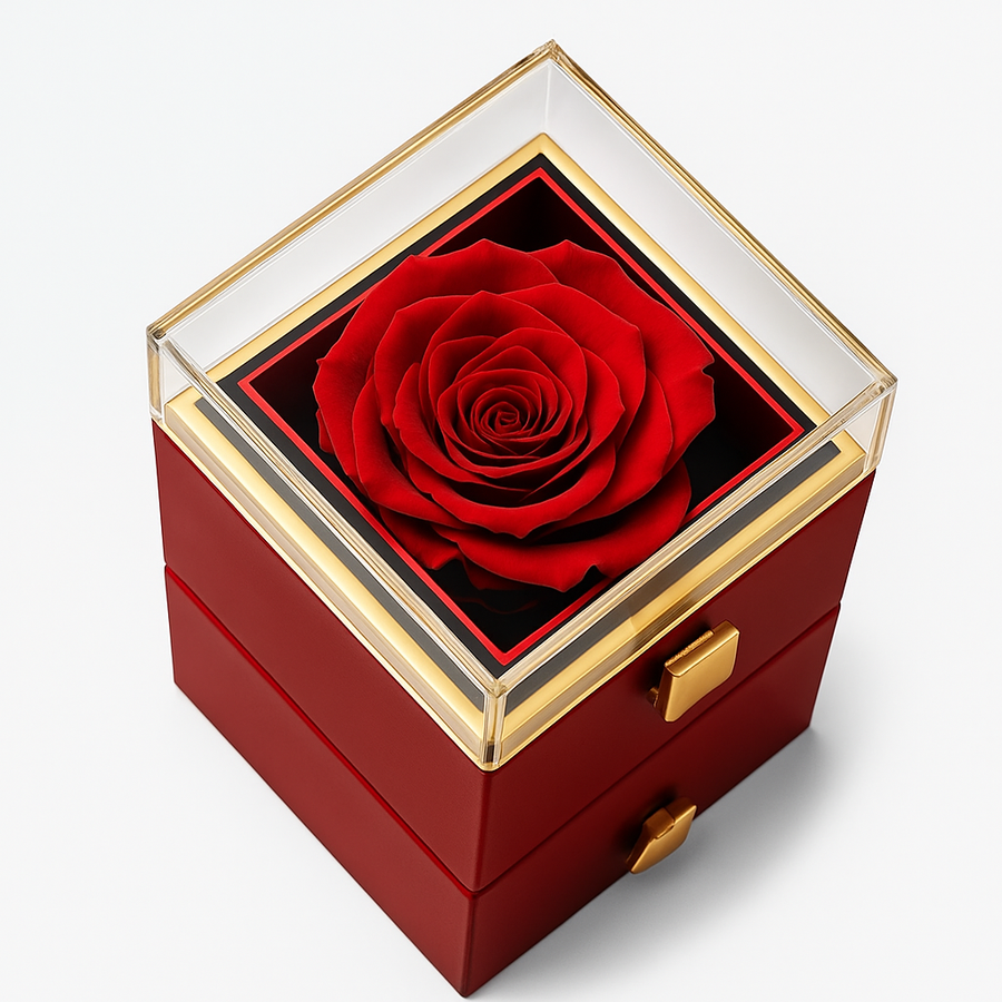 Présentée dans un coffre raffiné, la rose devient bien plus qu’un simple cadeau. Une véritable pièce de décoration premium.
